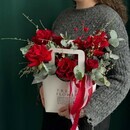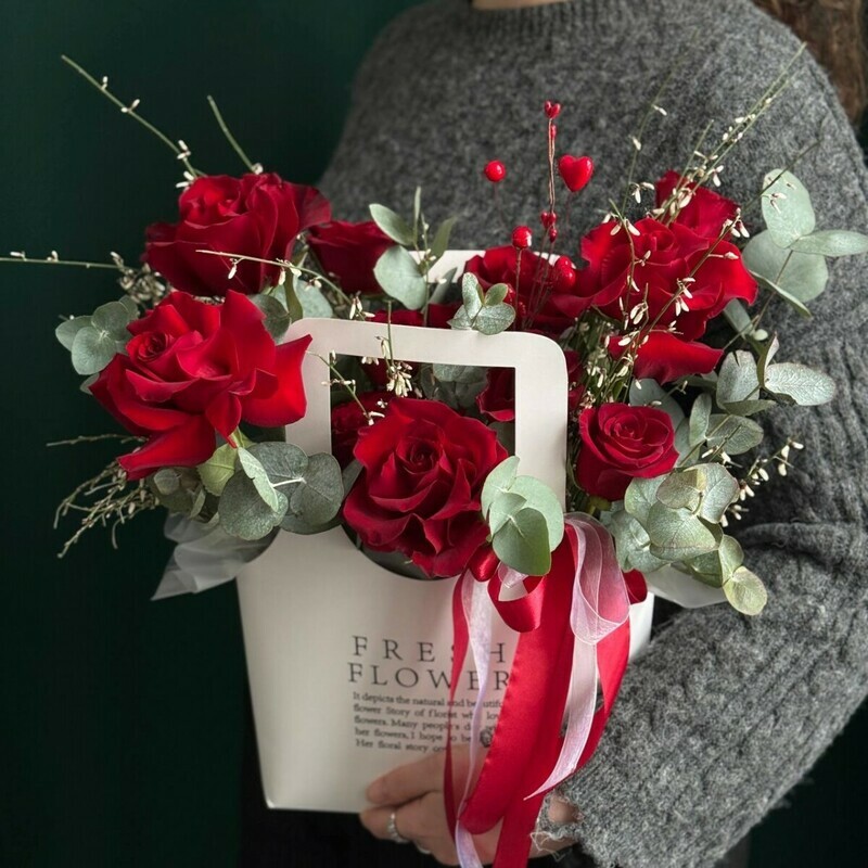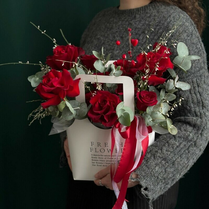 Mono-kompozitciya iz krasnih frantcuzskih i kenijskih roz s evkaliptom i romantichnimi dekorativnimi vetochkami gotova otpravit_sya na dostavku pryamo sejchas i radovat_ vashego poluchatelya (mamu, babushku, tetyu, sestru, devushku, zhenu, kollegu, podrugu) krasivimi tcvetami