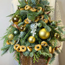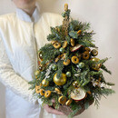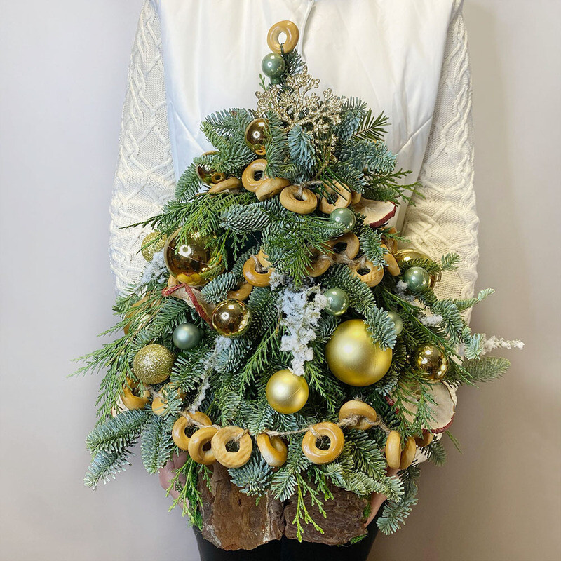Pishnaya miniatyurnaya yolochka iz aromatnih vetok pihti i pushistoj tui, ukrashennaya siyayushimi zolotimi i izumrudnimi sharami. Eyo glavnoe ocharovanie — rossip_ zolotistih sushek, budto tol_ko chto iz russkoj pechi, i lyogkoe ubranstvo iz azhurnoj snezhinki i nezhnogo snezhnogo asparagusa. Vsya kompozitciya sobrana v uyutnoj podarochnoj korobke, sozdavaya obraz domashnego tepla, sladkogo ozhidaniya prazdnika i toj samoj skazki, chto pahnet hvoej, mandarinami i detstvom.
