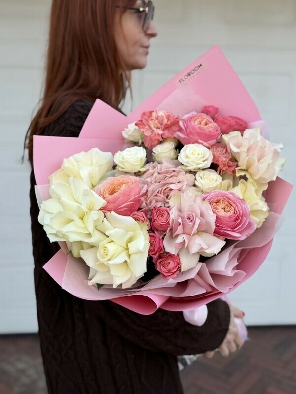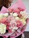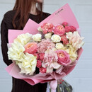- YArkij buket iz Pionovidnih roz, kustovih roz, gortenzii i diantusov