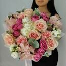- Buket iz roz, kustovih pionovidnih rozochek, gortenzii, al_stromerii, eustomi i gvozdiki