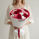 - Buket iz krasnih roz, hlopka i rozovih gvozdik