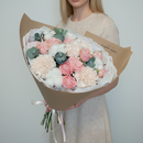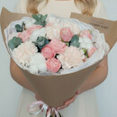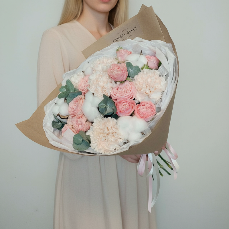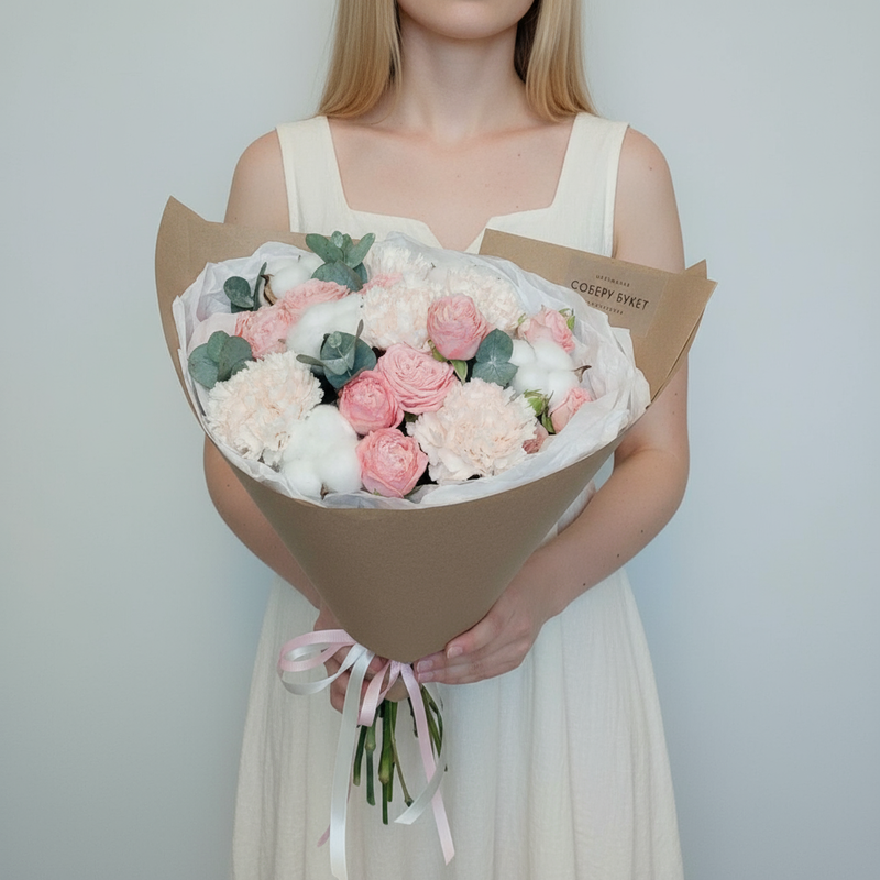 Avtorskij buket s pionovidnimi rozami, hlopkom i gvozdikami