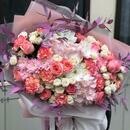 - Bol_shoj buket iz gortenzij kustovih i krupnih pionovidnih roz, hrizantemi, nezhnih diantusov