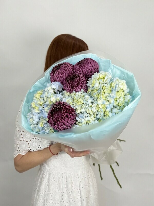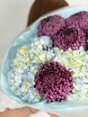 Buket iz golubih Gortenzij i hrizantem Bigudi