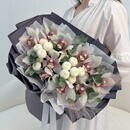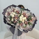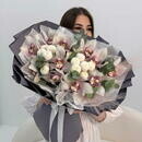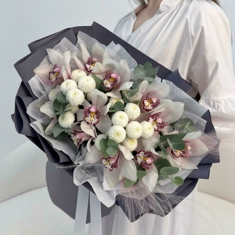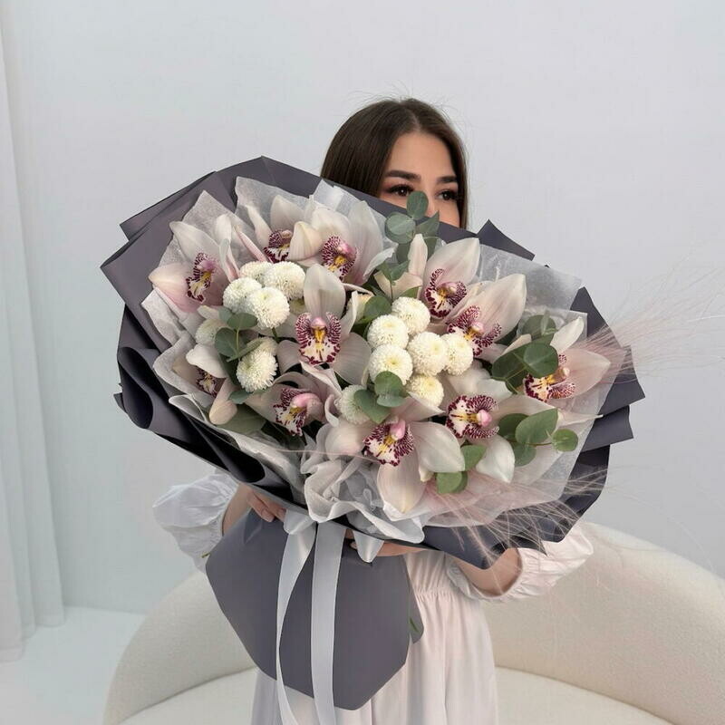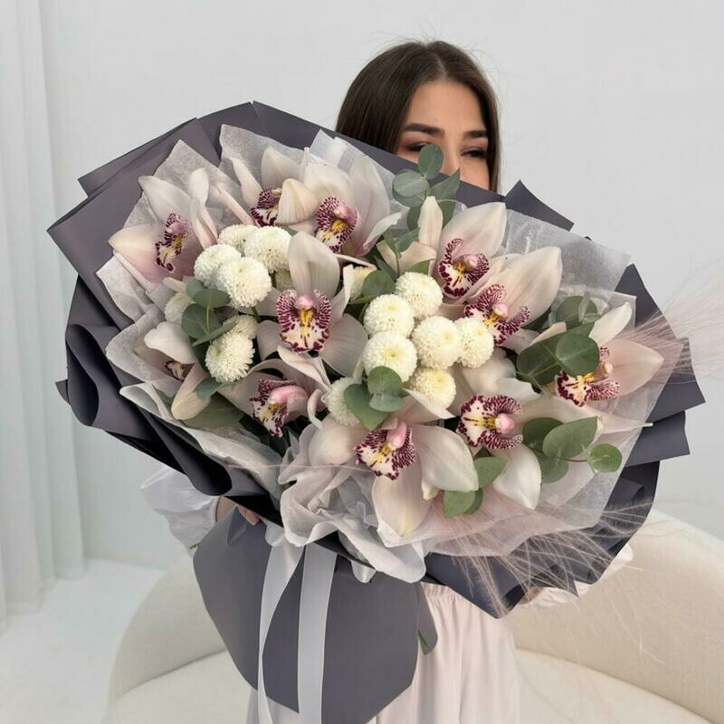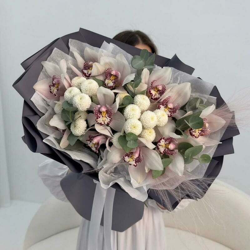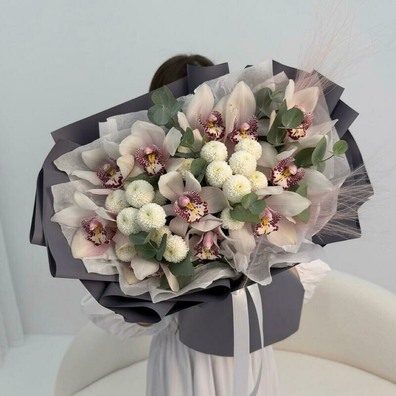 - Avtorskij buket: orhideya tcimbidium, hrizantema, evkalipt Razmer M