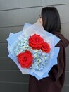 - YArkij buket iz frantcuzskih alih roz i goluboj gortenzii