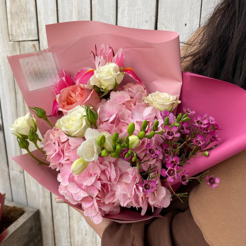 Buket s rozovoj gortenziej i freziej