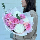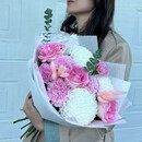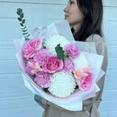 - Nezhnij Buket iz rozovih roz, belih hrizantem i gvozdik