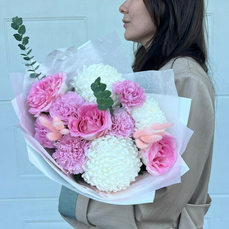 Nezhnij Buket iz rozovih roz, belih hrizantem i gvozdik