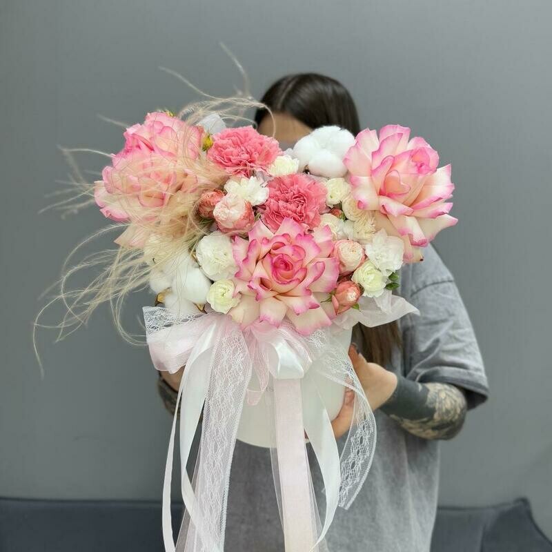 - «Strawberry milk» boks s frantcuzskimi rozami i hlopkom