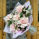 Buket iz rozovoj frantcuzskoj vivernutoj rozi so stojkoj al_stromeriej