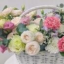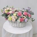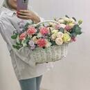 - Korzina s tcvetami. Belie rozi, aromatnaya mattiola i gvozdiki