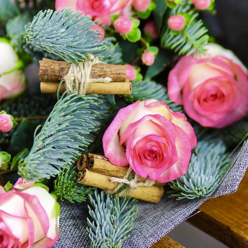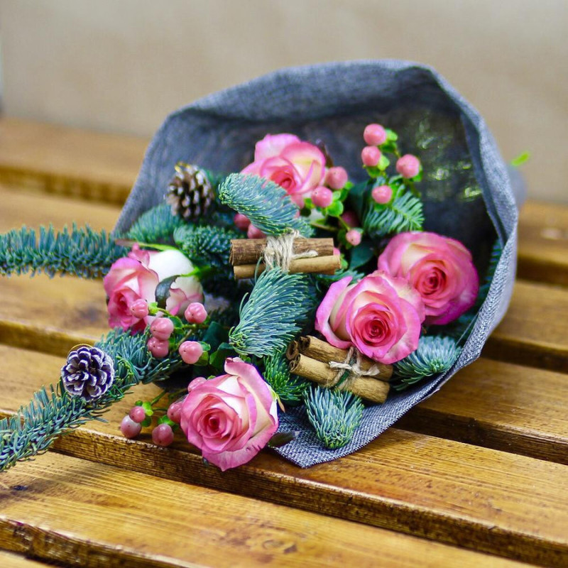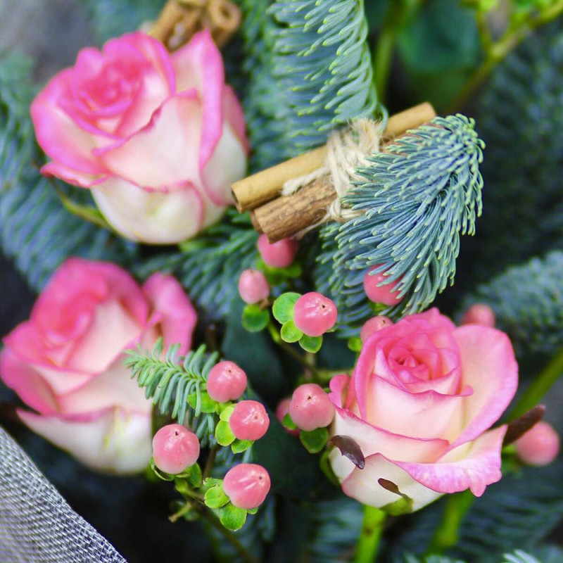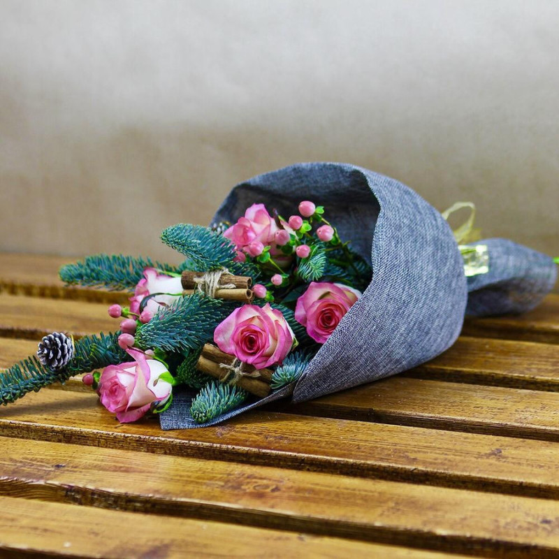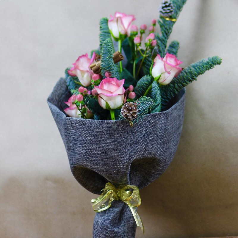 Novogodnij mini buket s elkoj i shishkoj