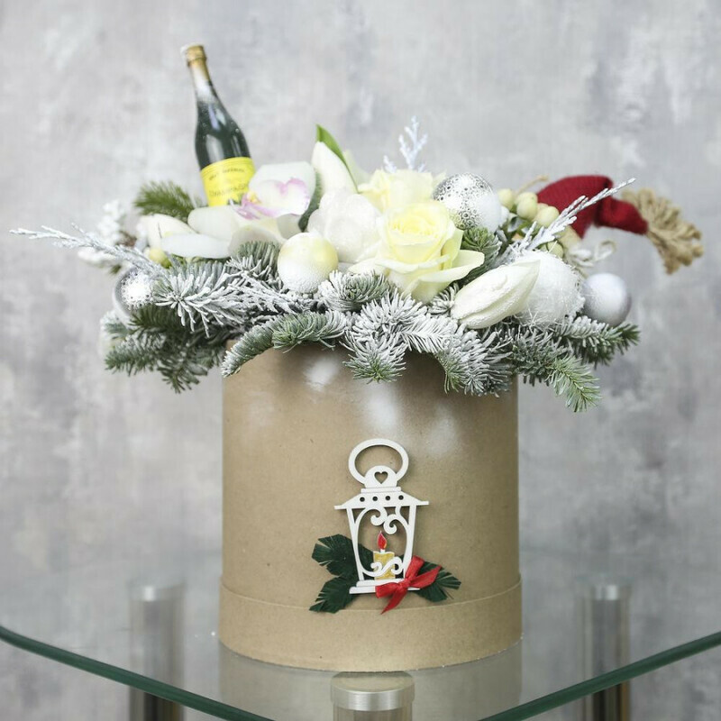 Novogodnyaya kompozitciya v shlyapnoj korobke