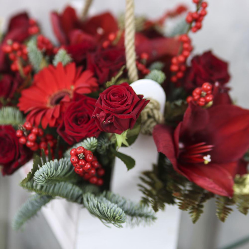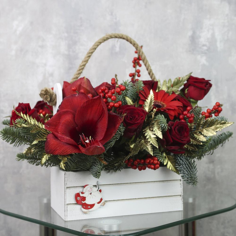 YArko krasnaya novogodnyaya kompozitciya v yashike