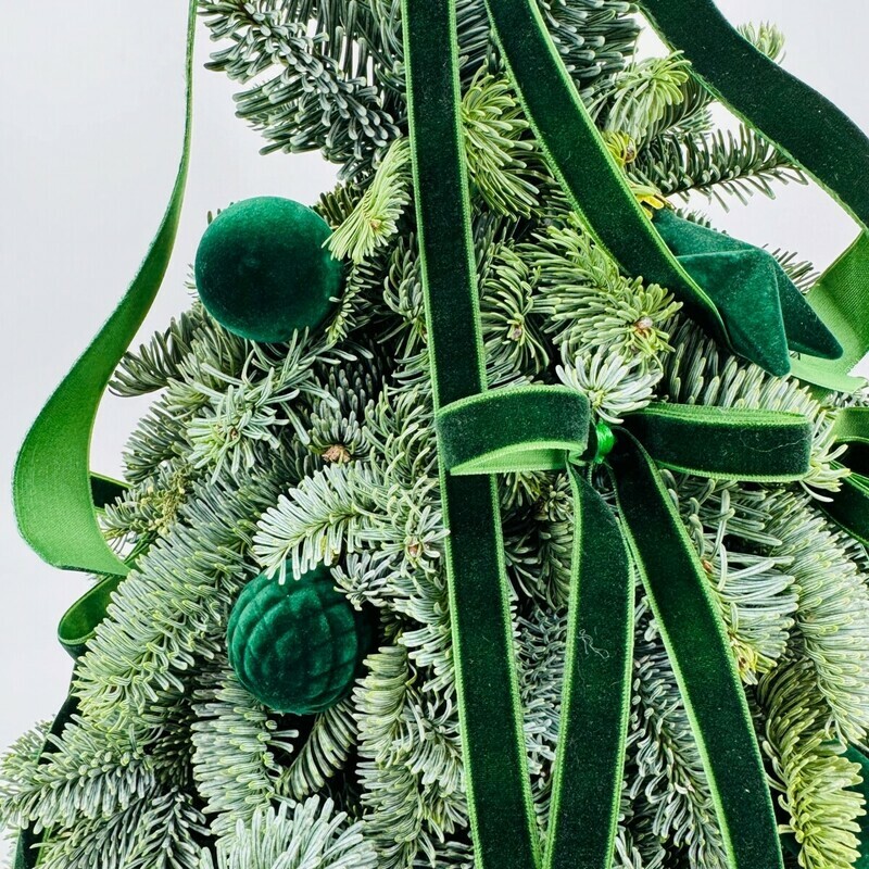 Novogodnyaya yolochka 50 sm iz vetok nobilisa s barhatnimi bantikami i igrushkami