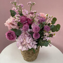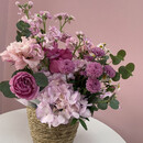 Eta iziskannaya tcvetochnaya kompozitciya v pletyonoj korzine slovno voploshaet nezhnost_ utrennego rassveta. Nezhnie ottenki rozovogo i sirenevogo tcveta garmonichno sochetayutsya s sochnoj zelen_yu evkalipta, sozdavaya atmosferu uyuta i romantiki.