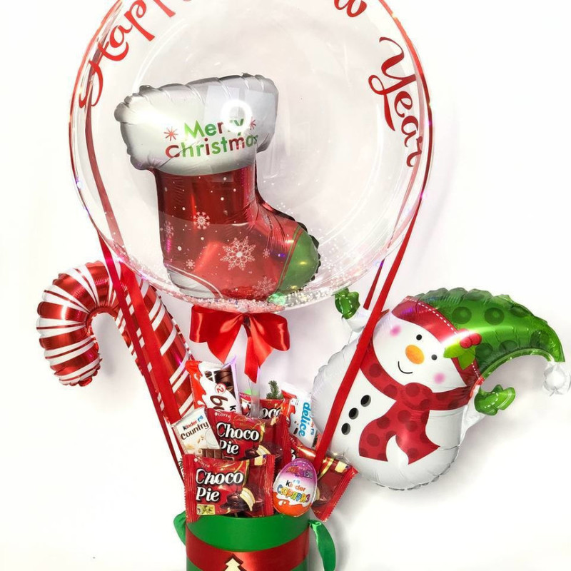 Na Novij god, Rozhdestvo prinyato darit_ sladkie podarki, konfeti, shokoladki i drugie sladosti. Mi predlagaem prepodnesti original_nij i sladkij buket s sharom, s tematicheskimi fol_girovannimi ili lateksnimi sharikami v vide golovi olenya, rozhdestvenskogo noska, yolochki, pryanichnogo domika, ledentca trosti, deda moroza, snegovika ili drugih tematicheskih geroev Novogo goda. Stil_nij buket, so sladkim napolneniem, garmonichno dopolnit obraz kostyuma dlya tematicheskoj vecherinki i podarit poluchatelyu yarkie vpechatleniya.