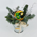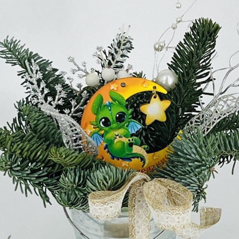 Vetochki nobilisa, s novogodnim dekorom i suvenirom v vide drakonchika na mesyatce, v vedyorke, eto stil_noe i effektnoe oformlenie buketa.