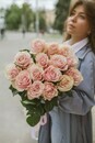 Buket iz nezhnih rozovih roz premialtnogo sorta s krupnim butonom