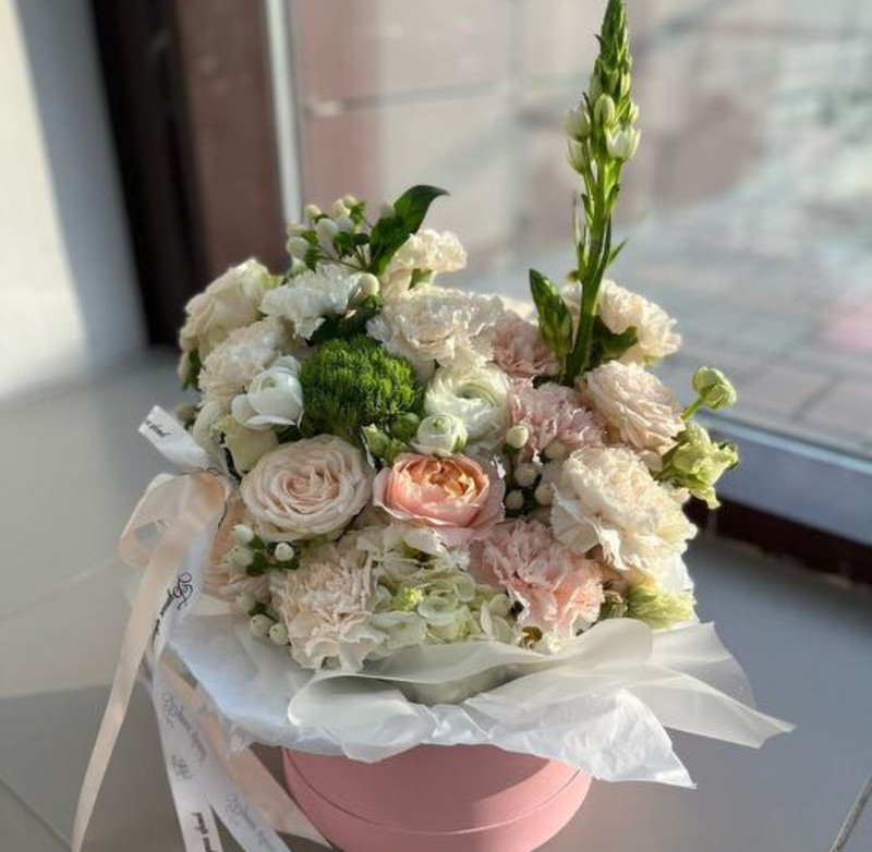 - Ekzoticheskaya kompozitciya s ranunkulyusami, pionovidnimi rozami i gortenziej