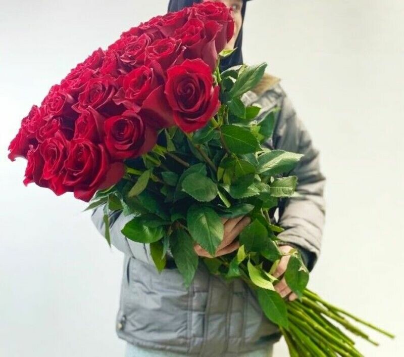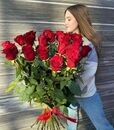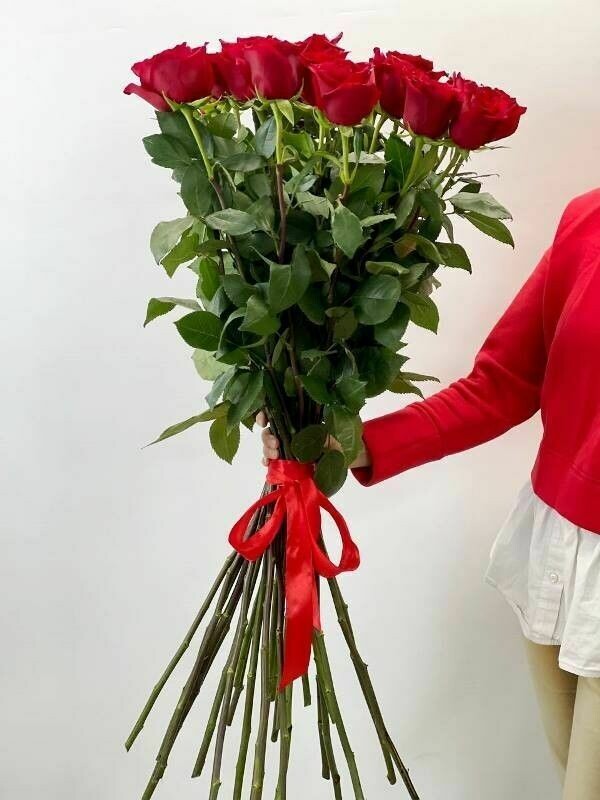 Roza krasnaya visota 90sm, lenta atlasnaya 40mm. Foto nosit oznakomitel_nij harakter. Buket budet sobran maksimal_no priblizhenno k foto.
