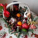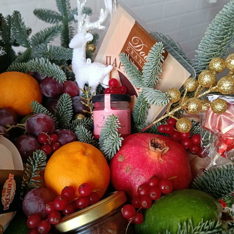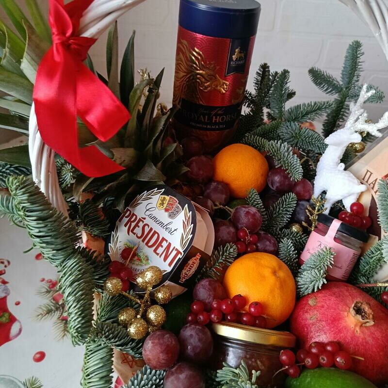 - Podarochnaya korzina s fruktami , sirami ,chaem i krasnoj ikroj Zimnij buket Fruktovaya korzina