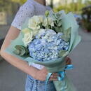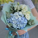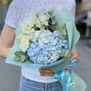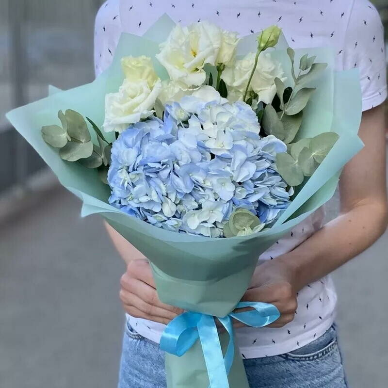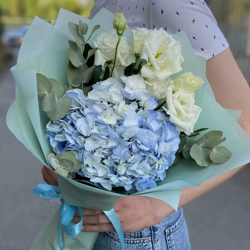 Gortenziya, evkalipt i eustoma Buket s eustomoj i goluboj gortenziej, premium