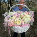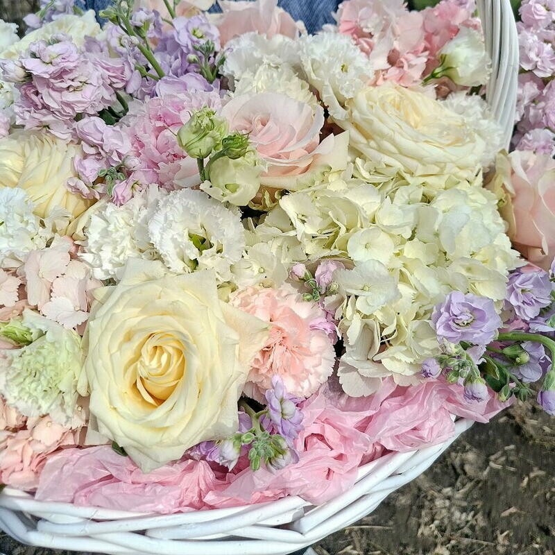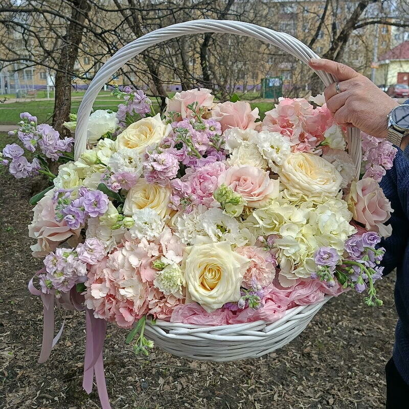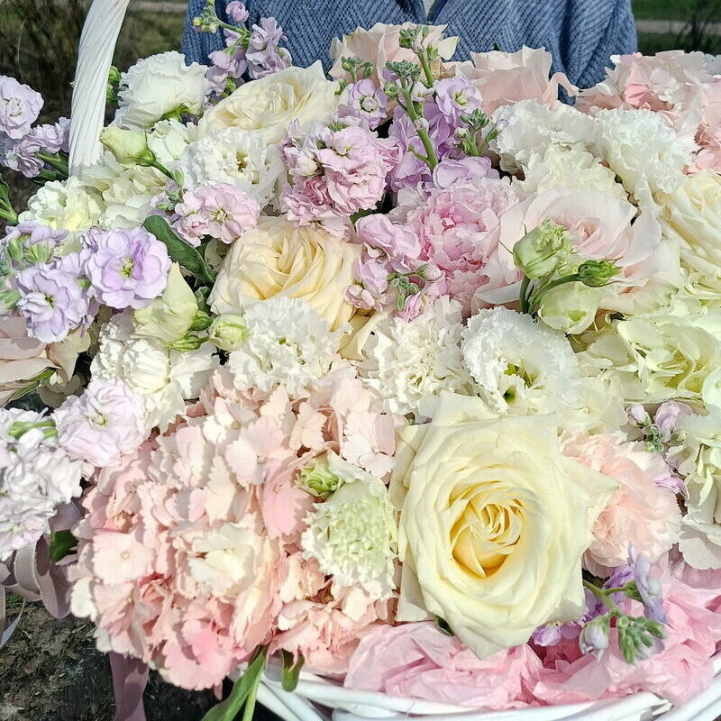 Premial_naya korzina s gortenziyami, pionami i pionovidnoj rozoj, premium