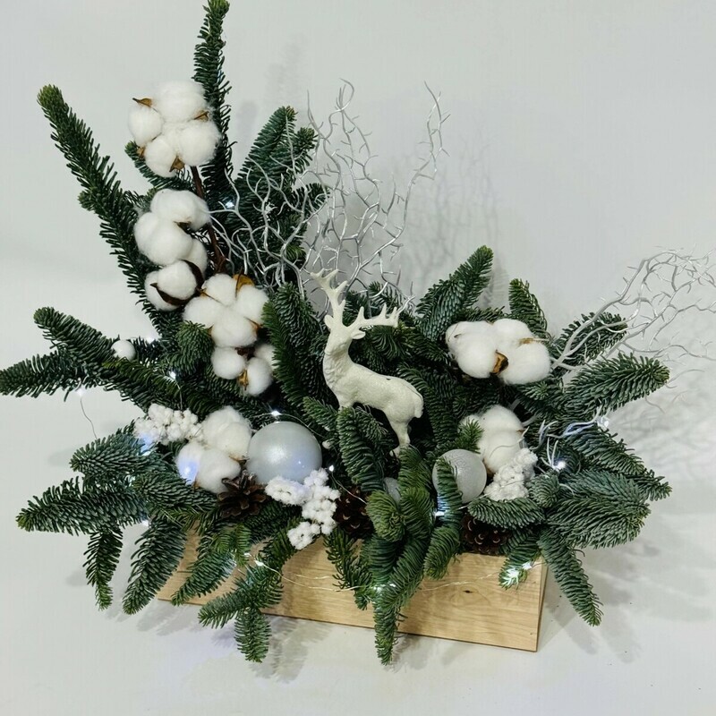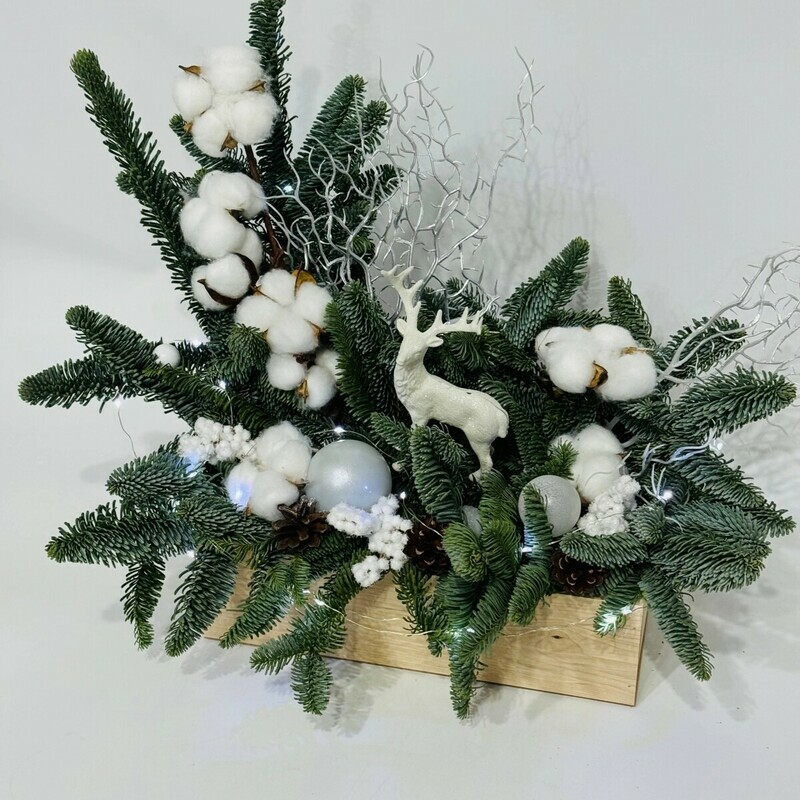 Pogruzites_ v atmosferu zimnej skazki s elegantnim buketom iz natural_noj hvoi nobilis, datskoj eli i lapnika. Eta voshititel_naya novogodnyaya kompozitciya, vipolnennaya v uyutnom derevyannom yashike, stanet ideal_nim ukrasheniem dlya vashego inter_era i podarkom dlya samih blizkih.