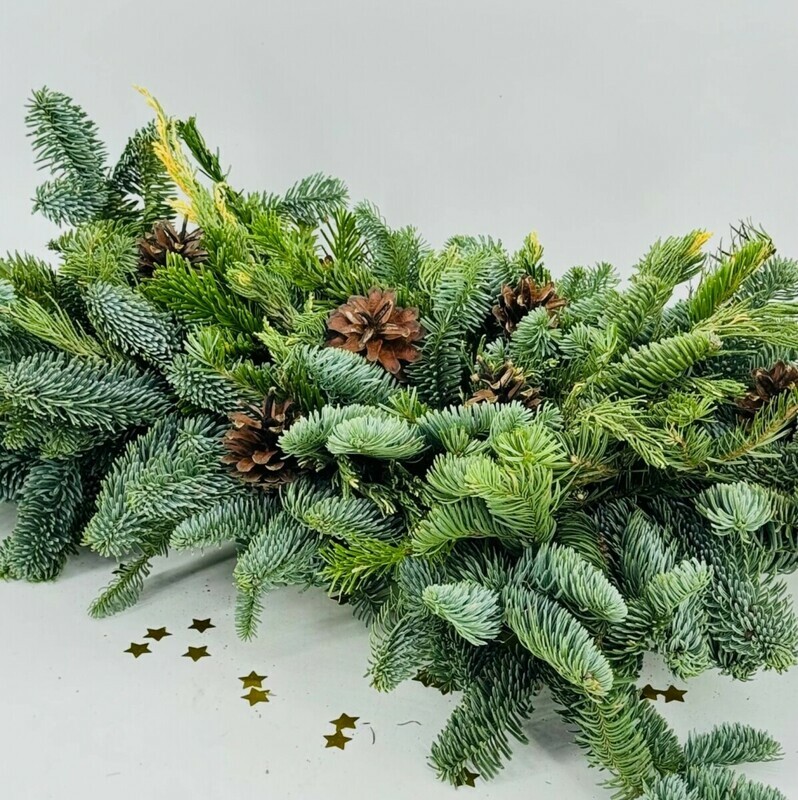 Nastol_naya kompozitciya novogodnyaya. Dekor na novij god iz vetok zhivoj hvoi nobilis, standart