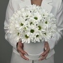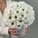 - Kompozitciya v shlyapnoj korobke s beloj kustovoj hrizantemoj