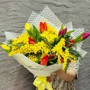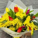 Na yazike tcvetov mimoza simvoliziruet neizmennost_ i postoyanstvo. Aromat etogo solnechnogo tcvetka snimaet stress, uspokaivaet i vselyaet optimizm. Efirnie masla mimozi sposobstvuyut ustanovleniyu mezhdu vlyublennimi polnogo vzaimoponimaniya i doveritel_nih otnoshenij. Tyul_pani, v sochetanii s vetochkami mimozi, smotryatsya nezhno i effektno. Eti aromatnie tcveti, oformlennie v stil_nuyu upakovku, stanut iziskannim syurprizom dlya vashej mami, lyubimoj devushki, uchitelya ili dochki. Podarite krasotu i nezhnost_ v den_ rozhdeniya, na Pshu, yubilej, imenini, Den_ Tat_yani, vipisku iz roddoma ili na takie vazhnie dati, kak 8 Marta i 14 Fevralya. Vashemu blizkomu cheloveku budet priyatno oshutit_ ves_ vostorg i teplo vashego vnimaniya, ukutannie v kazhdom butone etogo elegantnogo buketa!
