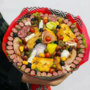 Etot buket budet vsegda k stati k zastol_yu ili vecherinke v krugu druzej! Inogda hochetsya prepodnesti v podarok chto to bolee neobichnoe chem traditcionnij buket, v etom sluchae vkusnij buket iz kolbas, sirov i drugih produktov, budet otlichnoj al_ternativoj.