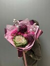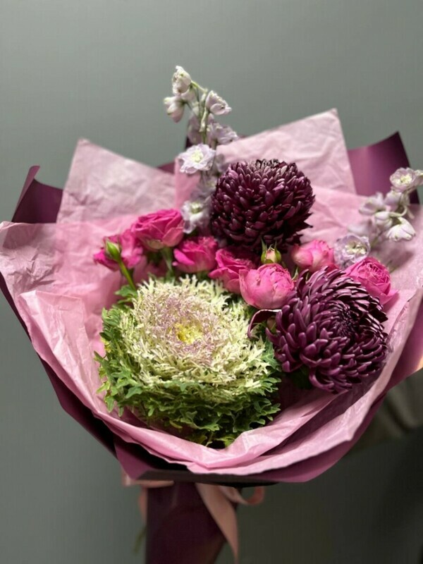 - Fioletovij buket s brassikoj i odnogolovoj hrizantemoj