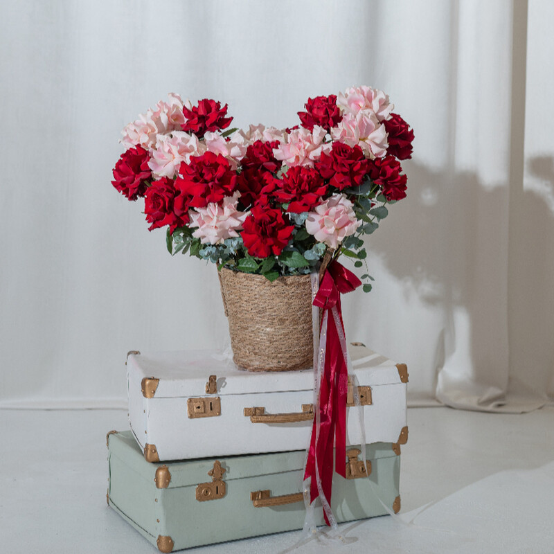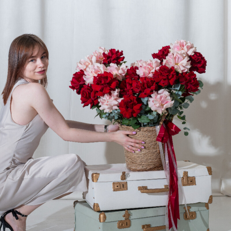 Velikolepnaya kompozitciya iz 35 frantcuzskih roz v myagkoj korzine