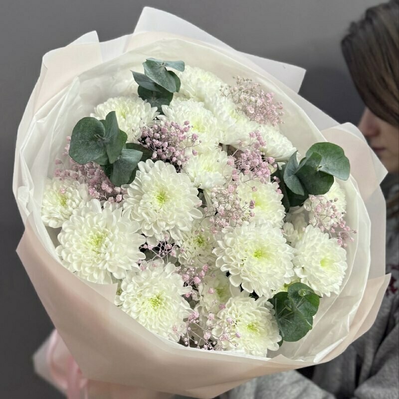 - Buket iz hrizantem, rozovoj gipsofili i vetochek evkalipta