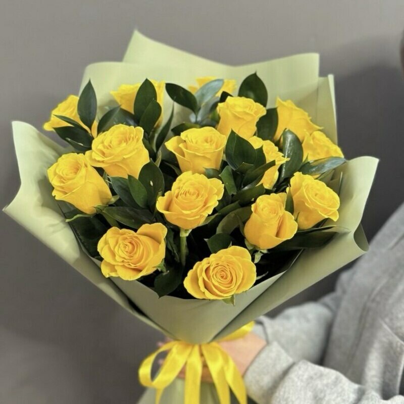 - Monobuket iz 15 zheltih roz s vetochkami ruskusa (Keniya 60 sm)