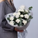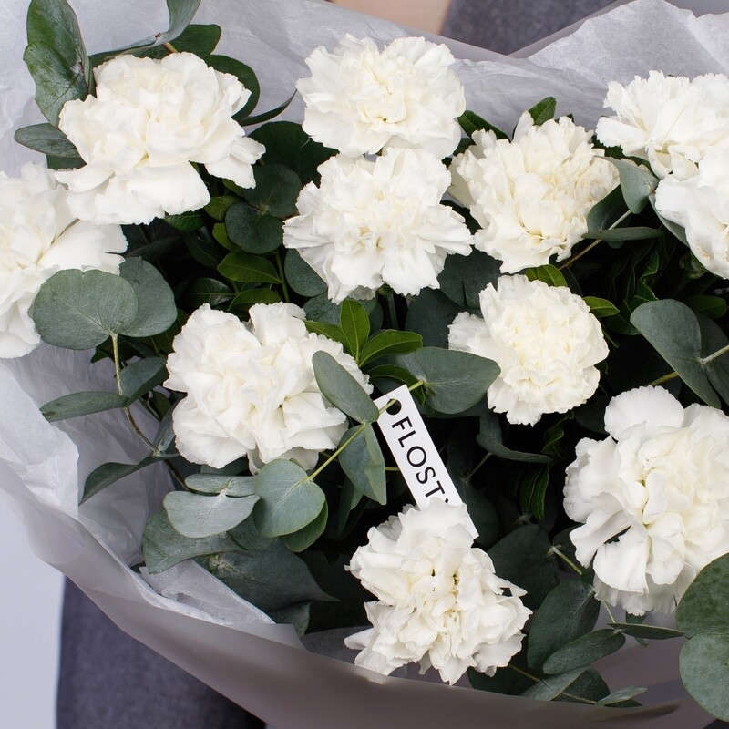 Iziskannij monobuket iz mahrovih belih diantusov v obramlenii aromatnogo evkalipta. Eto sochetanie simvoliziruet chistotu i svezhest_, a zelen_ pridaet kompozitcii zavershennij prirodnij sharm. Diantusi dolgo sohranyayut svezhest_ i raduyut svoej pishnoj teksturoj.