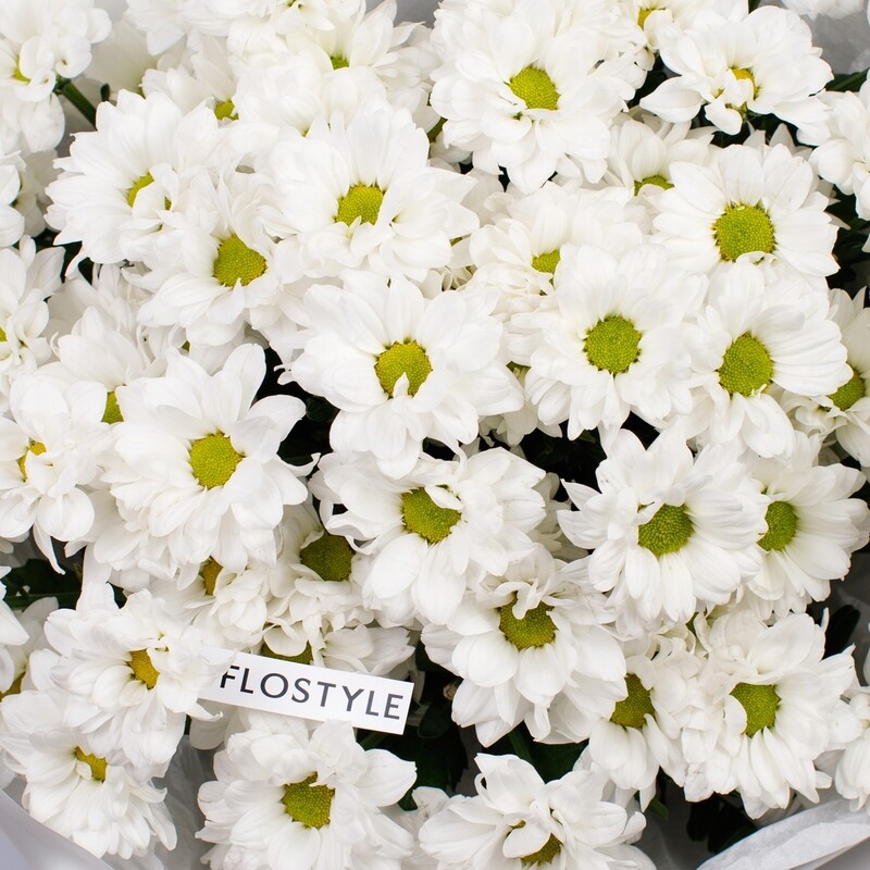 Sostav: Hrizantema Bacardi - 11 sht, Fistashka - 2 sht, Tish_yu belaya, Matovaya plenka belaya krugom