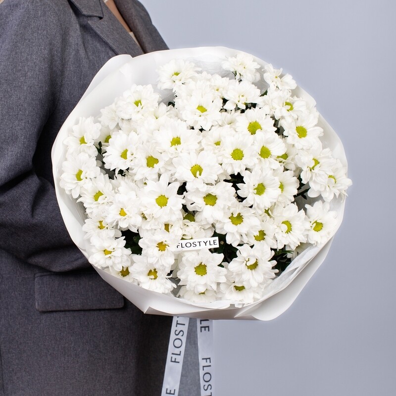 Legkij i trogatel_nij buket iz 11 vetochek romashkovoj hrizantemi. Eti zhizneradostnie tcveti napominayut sadovie romashki, no raduyut svoej svezhest_yu gorazdo dol_she, sozdavaya uyutnoe letnee nastroenie v lyuboj sezon.