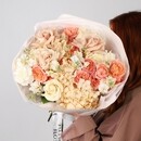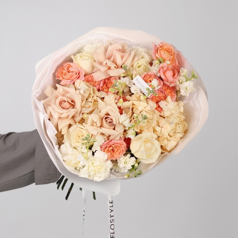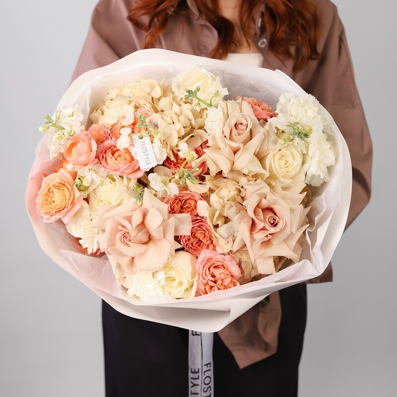 Roskoshnij buket v persikovih tonah ot FLOSTYLE. Neveroyatno nezhnaya i modnaya kompozitciya: frantcuzskie rozi, kustovie pionovidnie rozi Dzhul_etta s ih teplim abrikosovim ottenkom, redkaya persikovaya gortenziya, belaya mattiola, belie diantusi i belaya roza v utonchennom oformlenii. Ideal_nij podarok na 8 Marta, 14 fevralya, den_ rozhdeniya, godovshinu svad_bi, pomolvku ili rozhdenie malisha. Prekrasnij vibor dlya mami, zheni, sestri ili vozlyublennoj — persikovij tcvet simvoliziruet teplotu, nezhnost_ i iskrennost_ chuvstv. Mattiola napolnyaet komnatu volshebnim aromatom, a gortenziya dobavlyaet roskoshnogo ob_ema. Svezhie tcveti s dostavkoj po Novosibirsku i oblasti. Zakazhite etot modnij persikovij buket v FLOSTYLE pryamo sejchas!