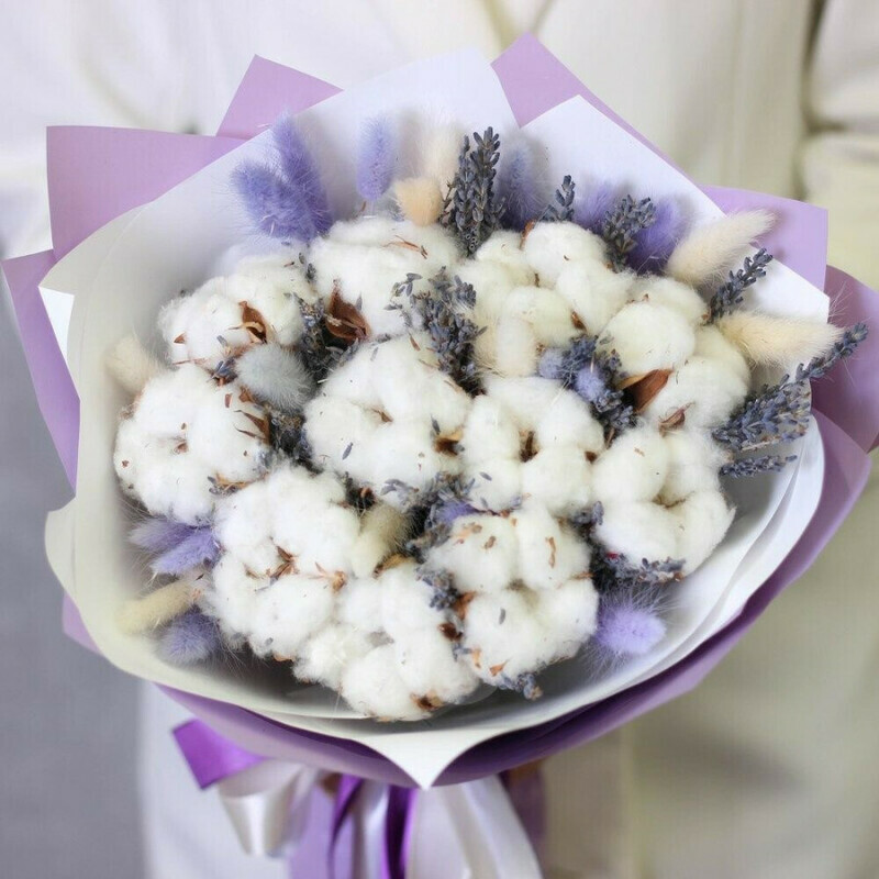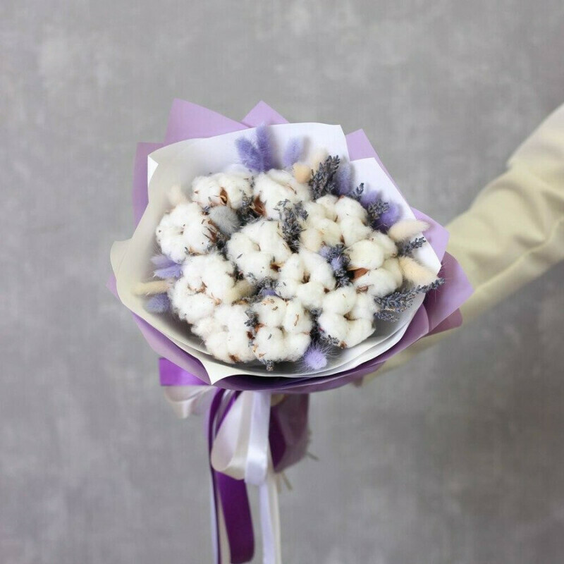 - Bouquet of dried flowers made of cotton and lavender Moment