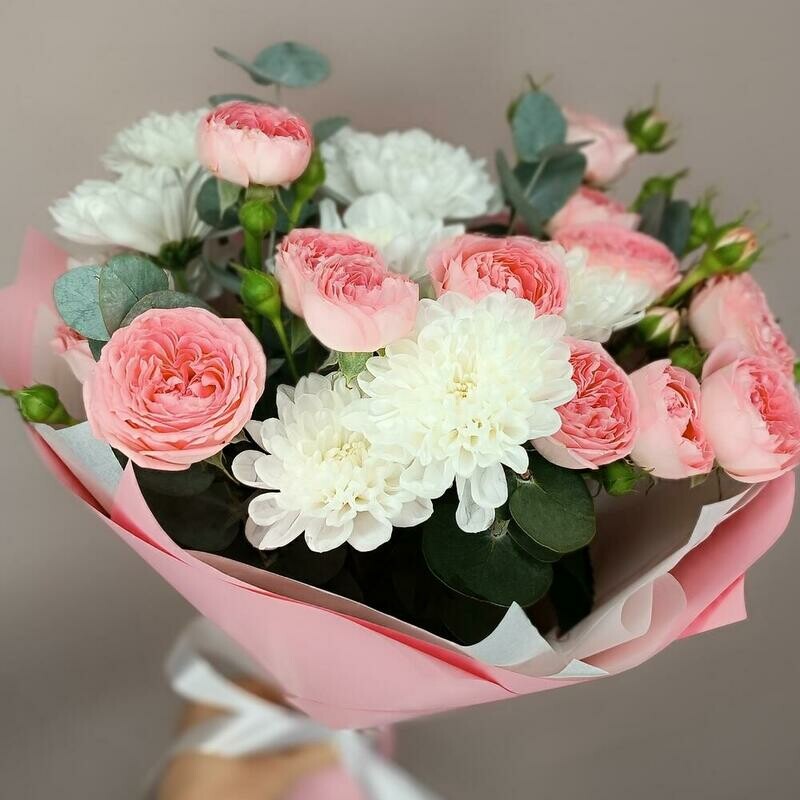 Kustovie rozi i belaya hrizantema s blagorodnim evkalipiom