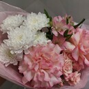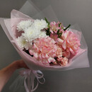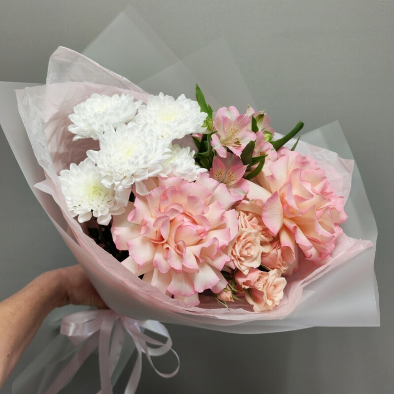 - Buket iz rozovih roz i hrizantemi