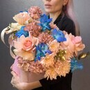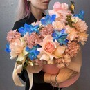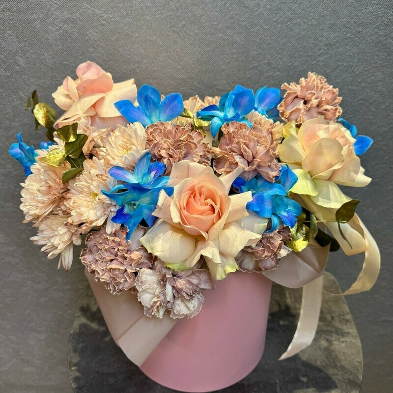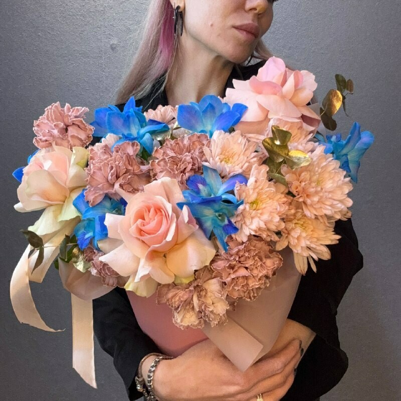 Nezhnie ottenki gvozdiki i hrizantemi v sochetanii s golubim dendrobiumom