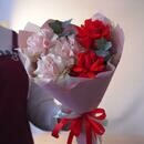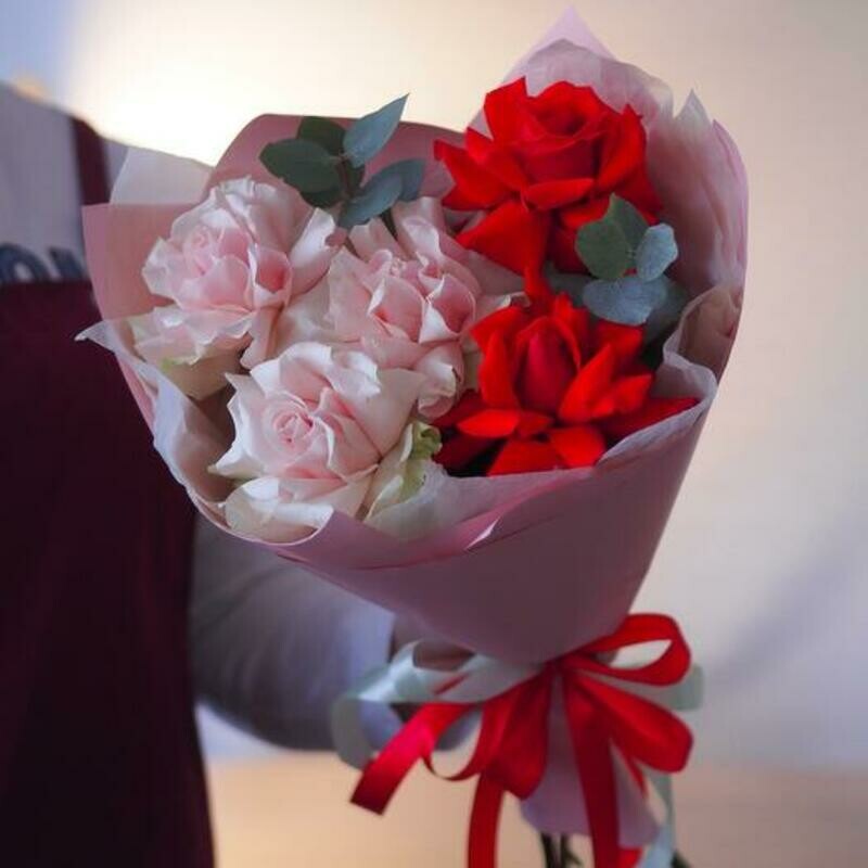 VAU buket iz 5 frantcuzskih roz s krasnim aktcentom i evkaliptom, standart