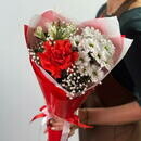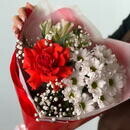 Buket kompliment iz krasnoj frantcuzskoj rozi, beloj hrizantemi i al_stromerii, standart