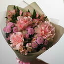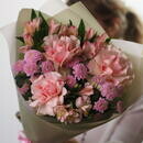 Buket iz rozovih frantcuzskih roz, hrizantemi i al_stromerii