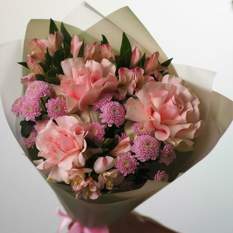 Buket iz rozovih frantcuzskih roz, hrizantemi i al_stromerii, standart